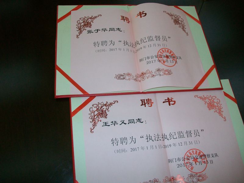 交警在對他們進行獎勵外,并給他們頒發(fā)了荊門交警支隊執(zhí)法執(zhí)紀監(jiān)督員聘書。