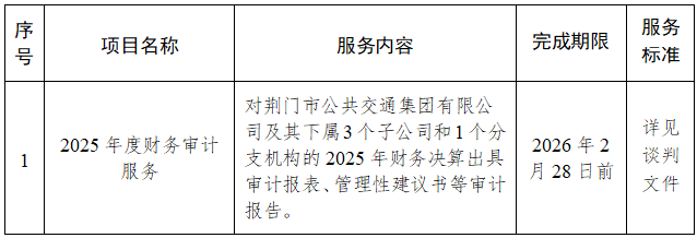 二、項(xiàng)目名稱:荊門市公共交通集團(tuán)有限公司2025年度財務(wù)審計服務(wù)項(xiàng)目